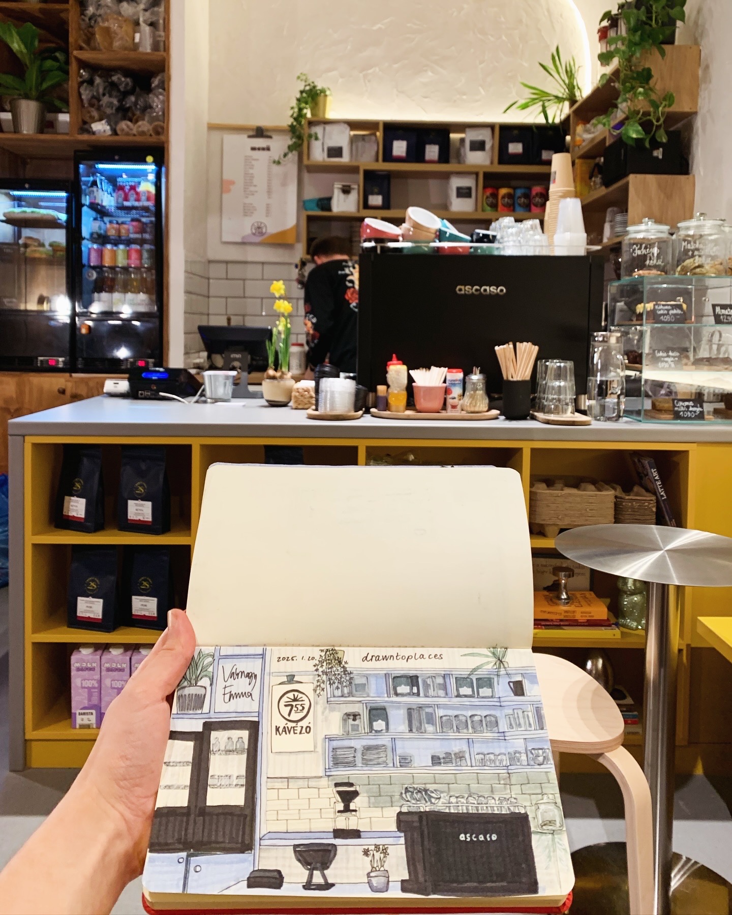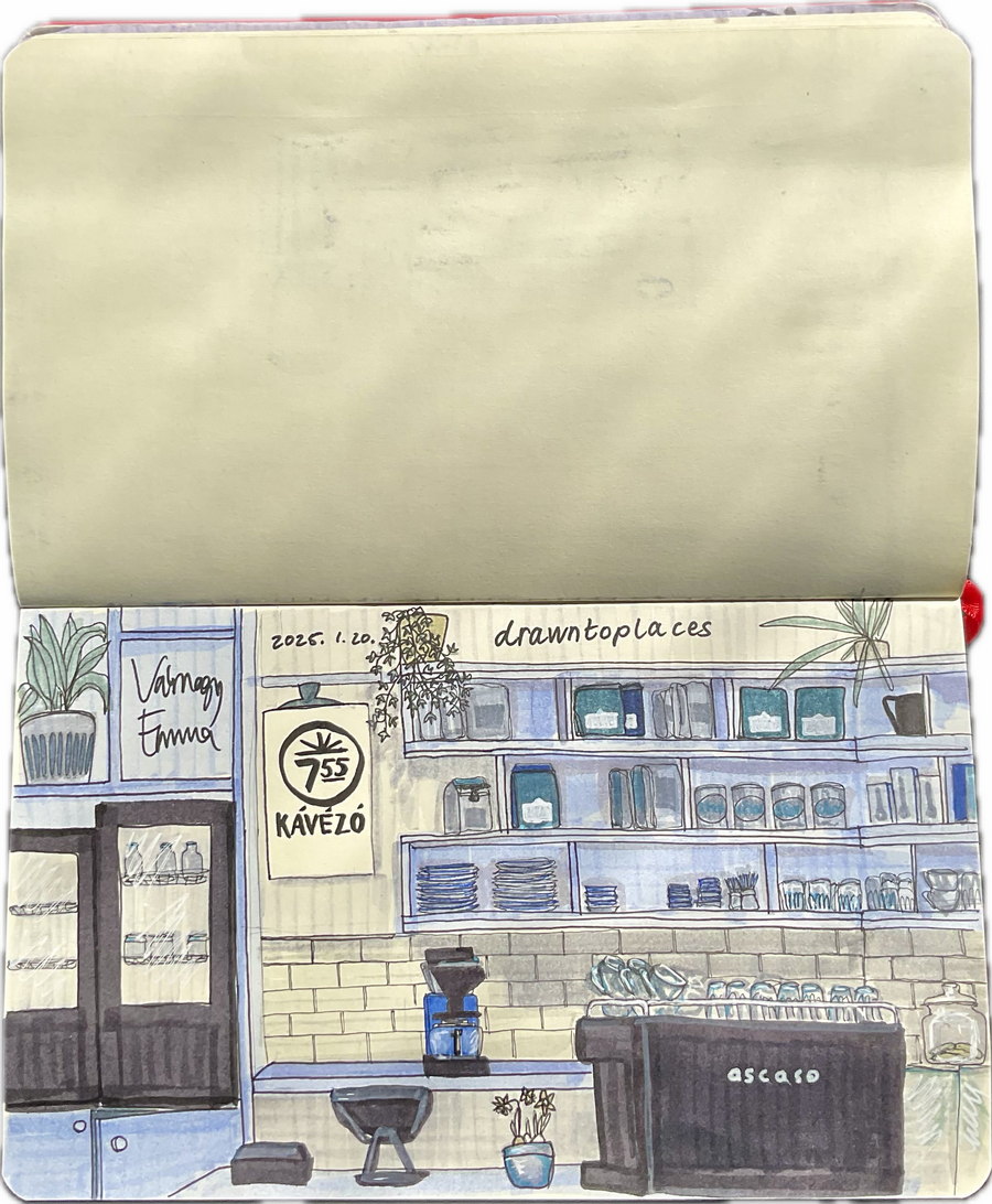 ☕ More espresso, less depresso—is the motto of 7.55 Coffeeshop and indeed I can't think of a better way to beat the Blue Monday blues with some 28 by Hernyák Gábor brews Super newly renovated with a stunning design, but their coffee, coziness, and kindness are the same. This is drawing no.101 in sketchbook vol.2