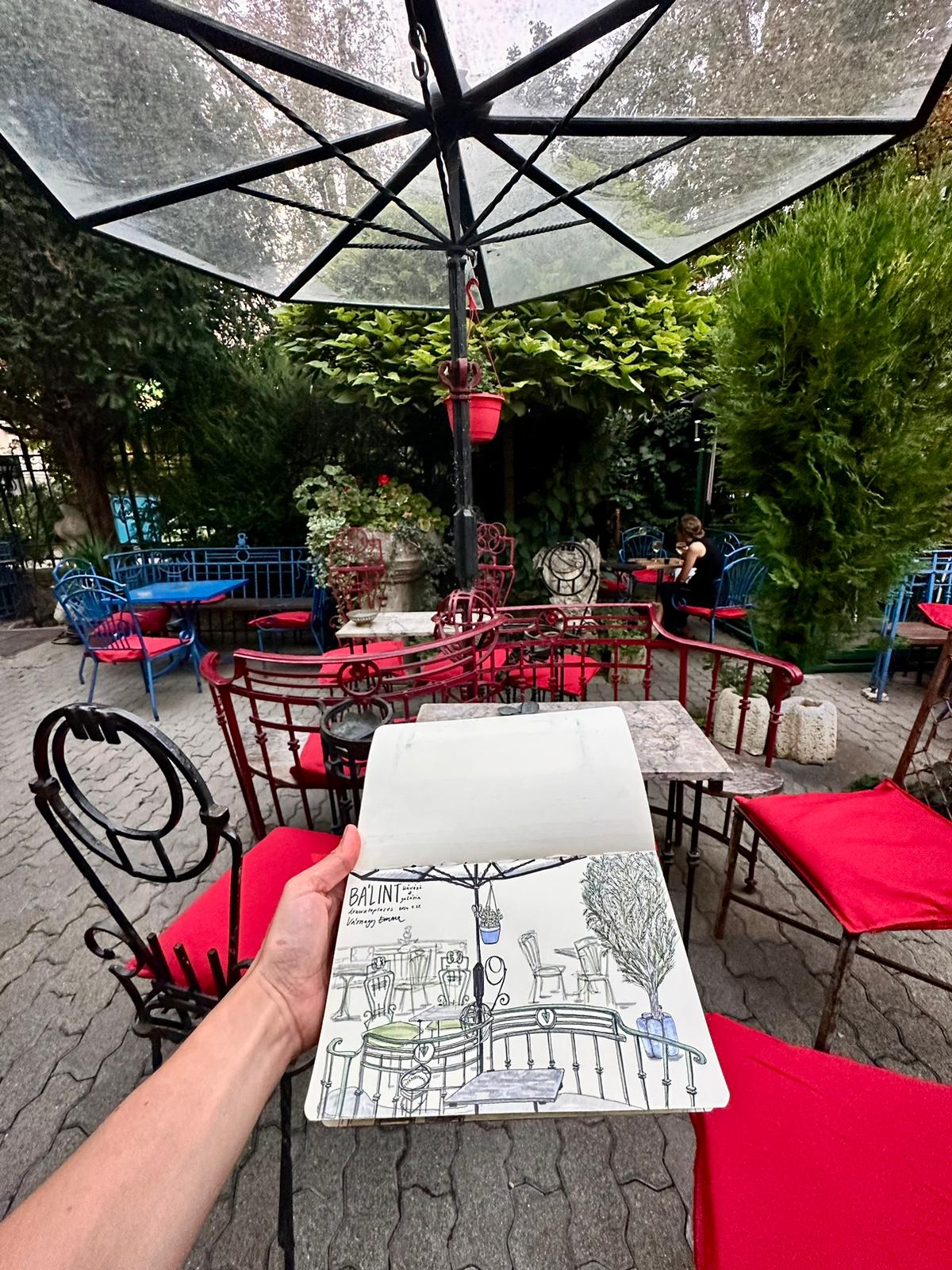 🍸 Bálint Galéria és Kávézó has a long family tradition—the current bartender is the 4th generation taking over since his great grandfather started this charming hidden spot in the historic Rózsa Villa in 1920. The furniture has its own stories too, like the blue garden chairs and tables that were saved from the iconic Hotel Budapest (the round hotel you likely passed on your way). Bálint has a knack for recommending the perfect drink and often surprises guests with special treats, like the fresh must (grape juice) he offered us last time. 🍇✨ This is drawing no.40 in sketchbook vol.1