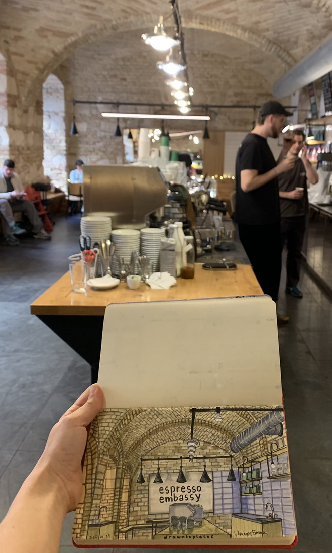 ☕️ | 💻 Espresso Embassy is a cozy co-working spot loved by uni students but just as great for a quick coffee break while exploring nearby sights like the shoes on the Danube bank or Liberty square. Offering a wide selection of Casino Mocca and Manhattan Coffee Roasters beans, plus everything you need to perfect your home brew. This is drawing no.102 in sketchbook vol.2