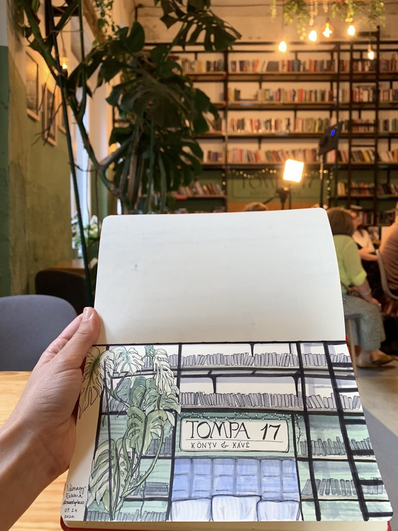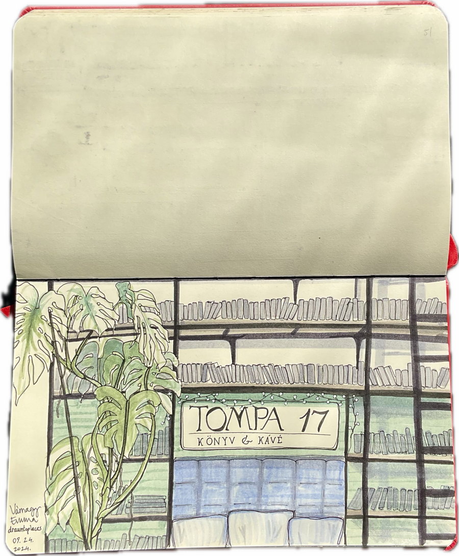 ☕ | 📚 Step into the living room of Tompa utca! This cozy spot is perfect for a relaxing coffee break surrounded by greenery and over 1000 books, free to loan. Look for the green library card to learn how to borrow from their collection, featuring contemporary Hungarian and world literature. Regular events, like the monthly Story-Cocktail evening bring the community together over local tales. This is drawing no.52 in sketchbook vol.1