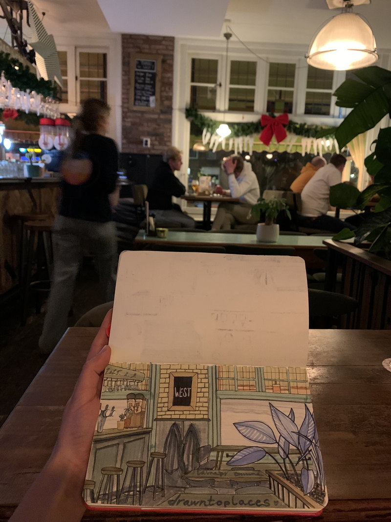 🍻 At Café West, you never have to search long for a vegetarian or vegan option – they have a separate menu just for that. Every Monday and Tuesday, you can enjoy selected wines and beers for just €4, and on Saturdays, all cocktails are only €6 until 18:00. They even have their own house-brewed pet beer and board games for a true "gezellig" time. This is drawing no.107 in sketchbook vol.2